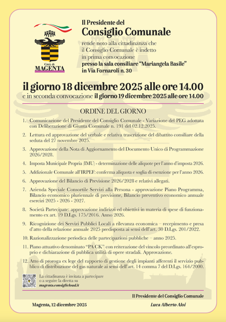La cittadinanza è invitata a partecipare o a seguire la diretta su magenta.consiglicloud.it