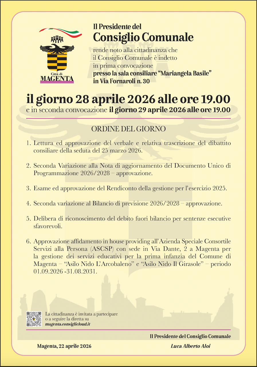 La cittadinanza è invitata a partecipare o a seguire la diretta su magenta.consiglicloud.it