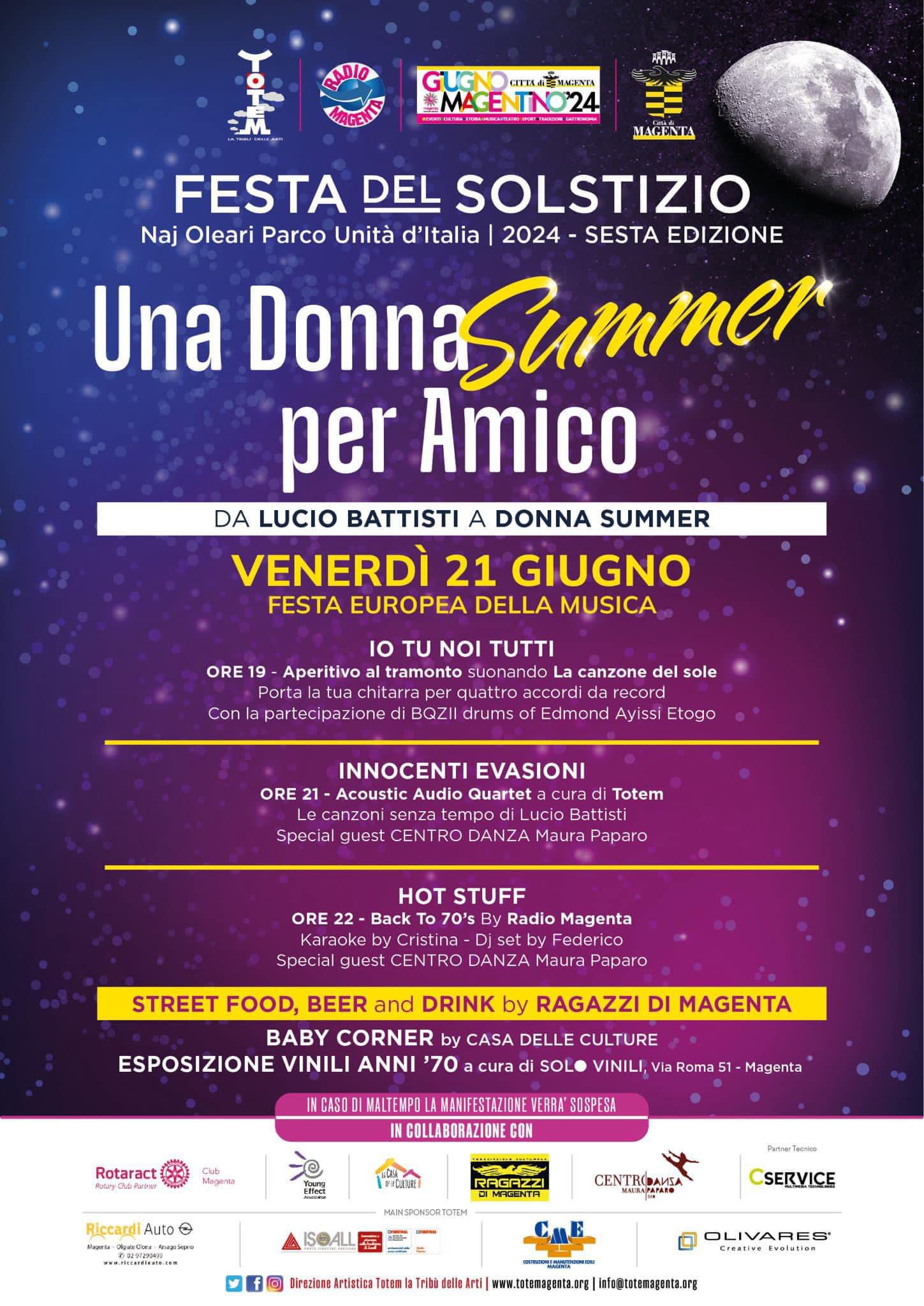 “Una Donna Summer per Amico” è il titolo di questa sesta edizione della manifestazione che celebra a Magenta la Giornata Internazionale della Musica: un viaggio ideale tra Lucio Battisti e Donna Summer, due grandi stelle della musica italiana e mondiale degli anni ’70.