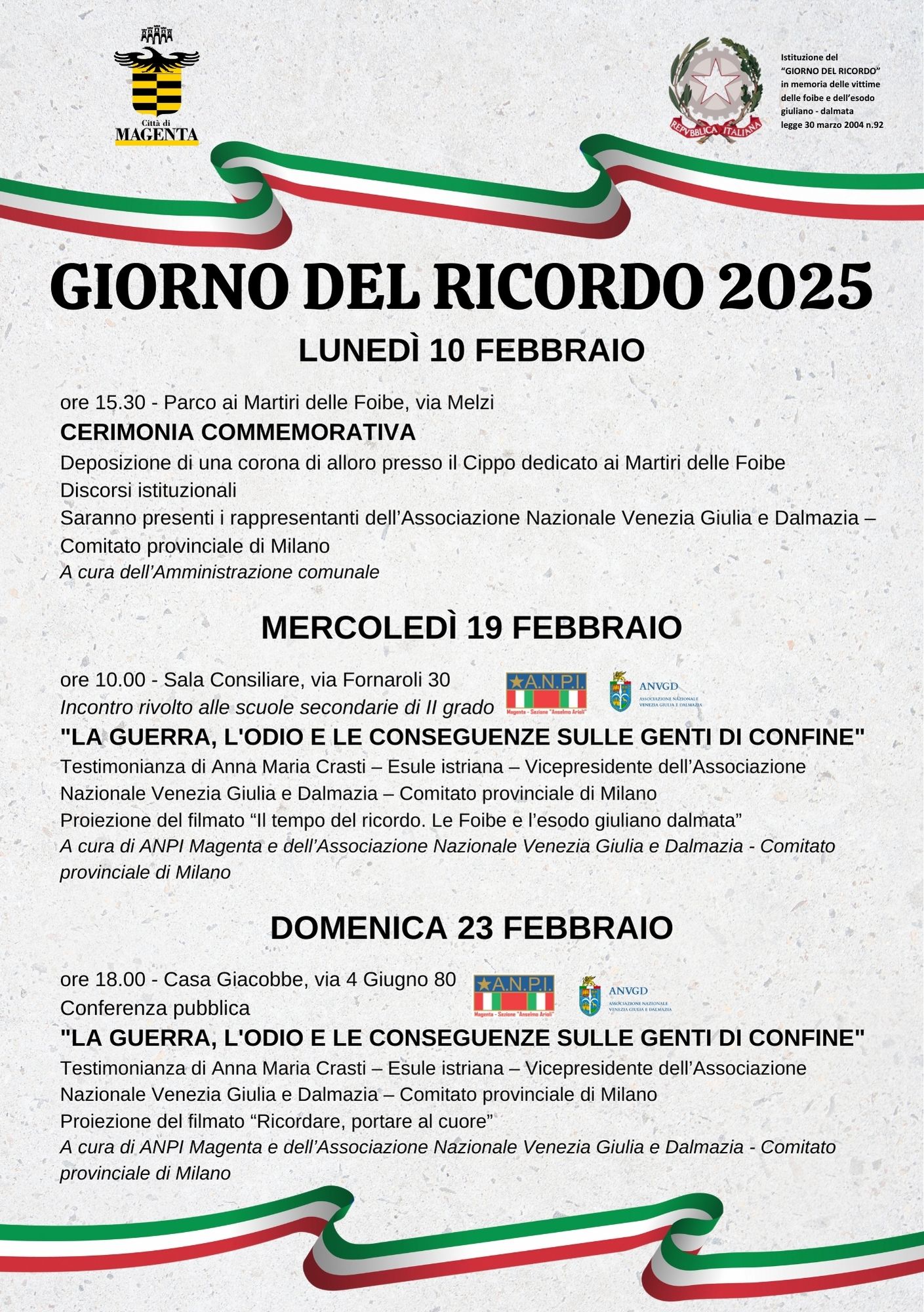 Magenta celebra la ricorrenza con una serie di appuntamenti organizzati dalla Amministrazione comunale insieme ad ANPI Magenta e all’Associazione Nazionale Venezia Giulia e Dalmazia.