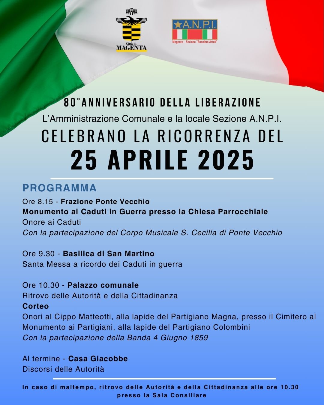 L’Amministrazione comunale e ANPI Magenta organizzano le celebrazioni per il 25 aprile e invitano tutta la cittadinanza a partecipare.