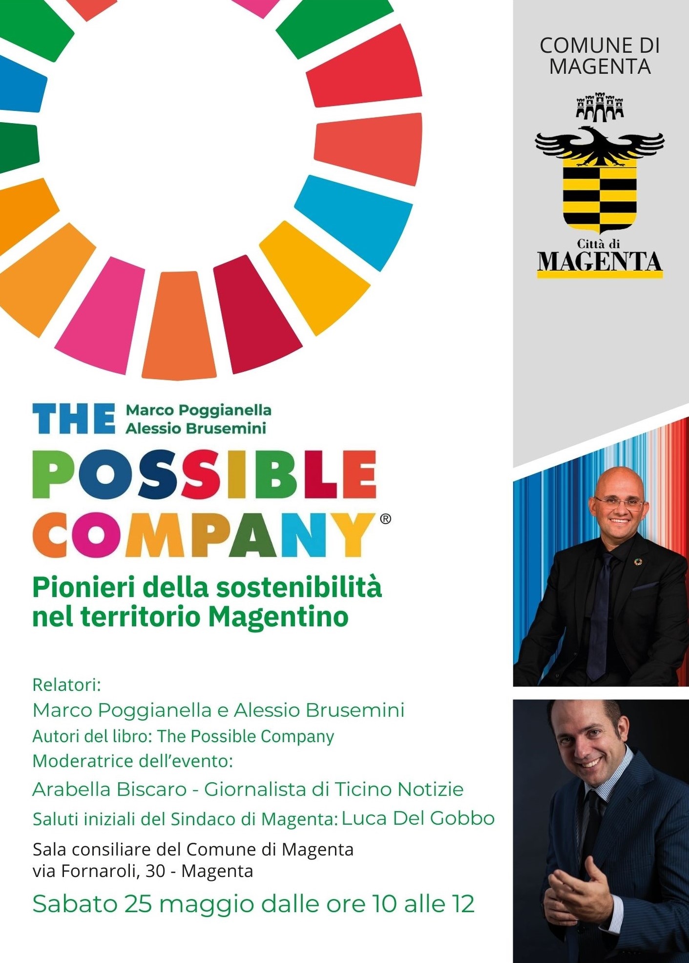 Si continua sabato 25 maggio dalle 10 alle 12 in Sala Consiliare con “The possible company – pionieri della sostenibilità nel territorio magentino”. Relatori saranno Marco Poggianella e Alessio Brusemini, autori del libro “The possible company, come fare impresa seguendo gli obiettivi per uno sviluppo sostenibile”.